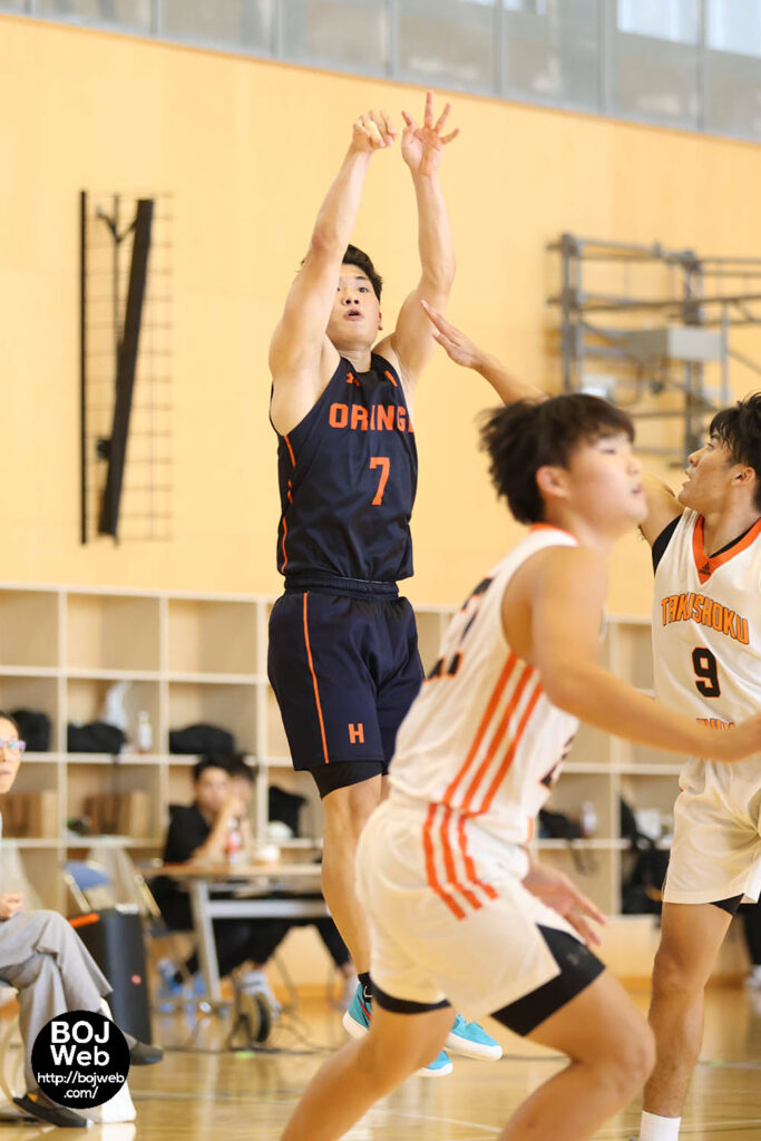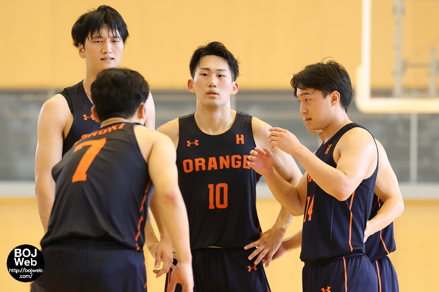第10戦、2部注目の首位・拓殖大と4位の法政大の対戦は、立ち上がりから互いに激しいディフェンスでロースコアの展開となるが、法政大はシュートの調子が上がらず、また守られてアテンプトも増えていかない。拓殖大もテンポはそこまで良くないが、#9白石(3年・PG)や#21竹江(2年・SG)がアタックの積極性を見せ、シュートも決まって前半は31-28とわずかにリードした。後半も僅差のまま一進一退の攻防が続くが、法政大は#0杉信(4年・PG)の機動力で拓殖大ディフェンスを翻弄し、またシュート確率も徐々に上がってくる。4Qには#7本山(4年・PG)のスリーポイントが流れを作ると、アウトサイドでは調子が上がっていなかった#25鍋田(3年・PG)のペイントアタックも決まってこのQで11-24と一気に引き離す形となり、56-65でロースコアゲームを制した。