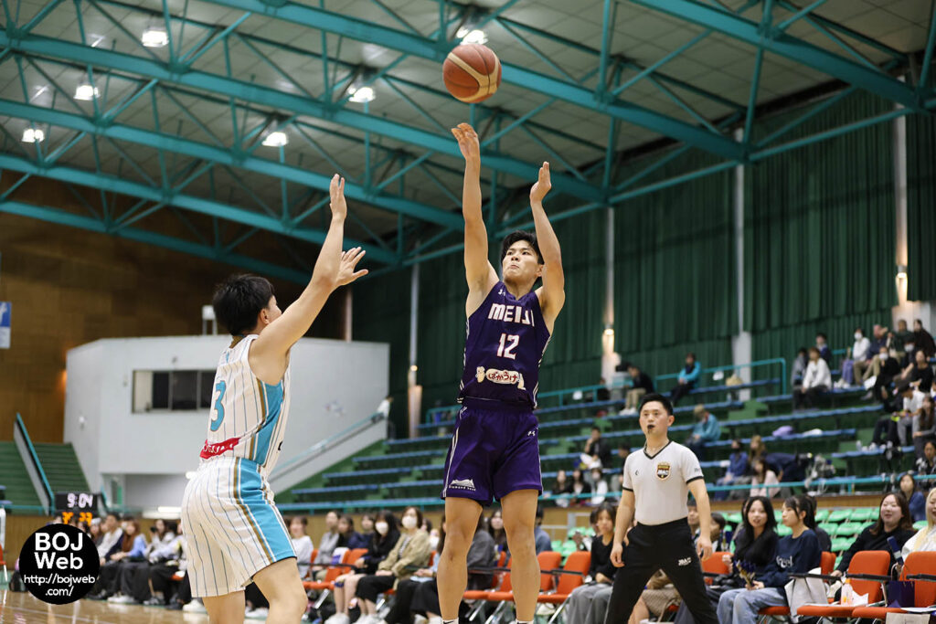 4連敗中の明治大は徐々に調子を上げてきていた筑波大と対戦。両者一時離脱していた選手たちが戻ってきており、明治大は#5針間、#26山際などが復帰。筑波大も#6副島(3年・C)、#18天内(3年・PG)、#34小田(2年・SG)ら、#16岩下(4年・PG)を除く面々が戻ってきた。しかし筑波大はオフェンス・ディフェンスとも波に乗れず、2Q以降に調子を上げた明治大に簡単に得点されてしまう。明治大は要所で#5針間や#12千葉(4年・PG)らの得点が決まり、76-53で勝利した。