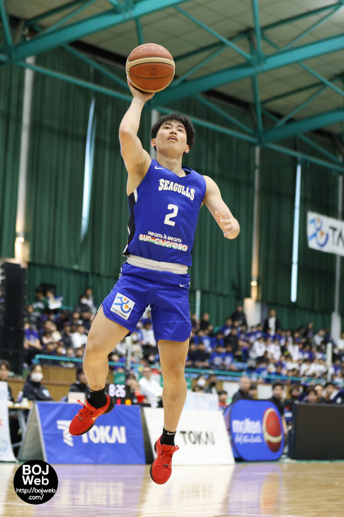 第1戦の対戦相手は日本大。1巡目は快勝している相手だが、2巡目も立ち上がりからリードする展開となった。ディフェンスの強い東海大に対して日本大はタフショットも続くが、#23ボロンボ(3年・C)のゴール下や#21西村(3年・PF)のスリーポイントが決まる。東海大は#25ムスタファ(2年・C)が1Qで2ファウルとなるが、大きな影響はなく#2轟(3年・PG)のレイアップも気持ちよく決まるなど、18-25と1Qで7点リードすると、2Qはベンチから出場の#9江川(2年・PF)のアウトサイドが好調。日本大は#13泉(4年・SG)が果敢に攻めていくが、東海大はやはりベンチからの#77直井(3年・SF)のスリーポイントで前半を35-50と大きく引き離して終えた。
