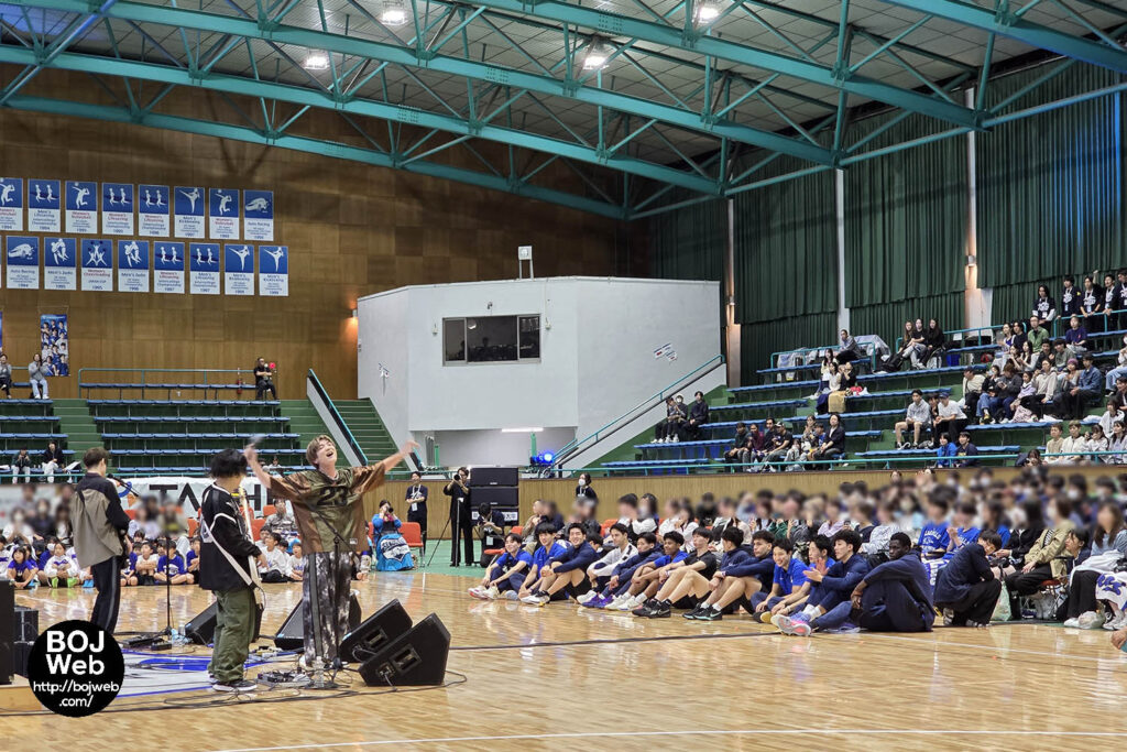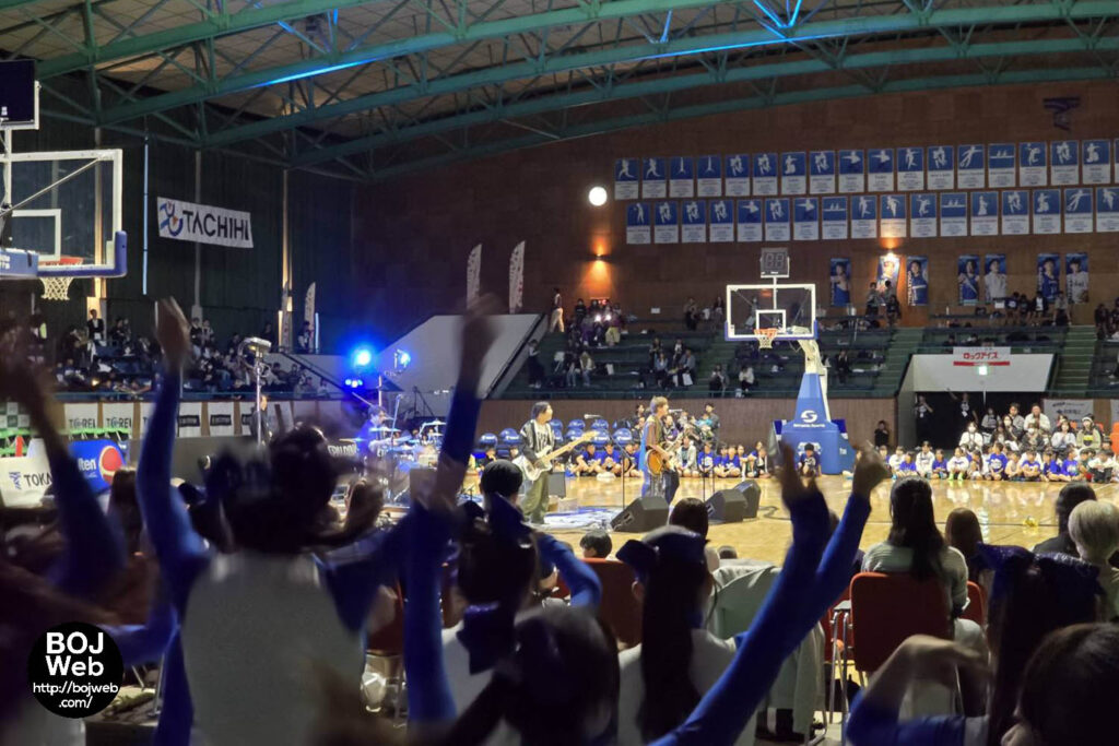 今年のホームゲームは試合終了後にもさまざまな楽しみがあった。まず入場のエスコートキッズを務めた子どもたちからの質問に#14鈴木主将が答えたあと、今回東海大学男子バスケットボール部SEAGULLSの応援ソング「Echoes」をリリースした4人組バンド、irienchy(イリエンチー)がミニライブを開催。会場の観客はもちろん、選手たちもフロアに座って曲を聞く中で3曲を熱唱。また「Echoes」の演奏時には東海大学チアリーディング部FINEが曲にあわせて演技を披露し、会場の一体感を高めた。