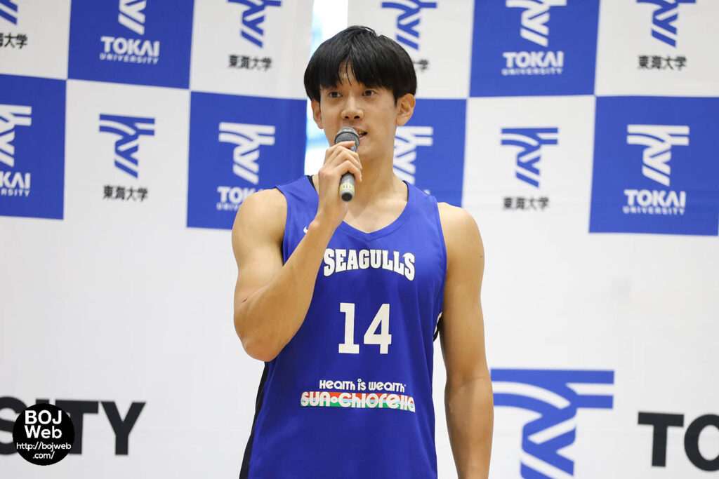 東海大#14鈴木暉將主将「今日は遠いところまで来ていただき、本当にありがとうございました。今シーズンは一人一人個性あふれる選手たちが揃っています。そういう選手たちが泥臭いディフェンスやリバウンド、ルーズボールで頑張れるチームです。明日の筑波大も甘いチームではないので切り替えてまたやっていきます」
