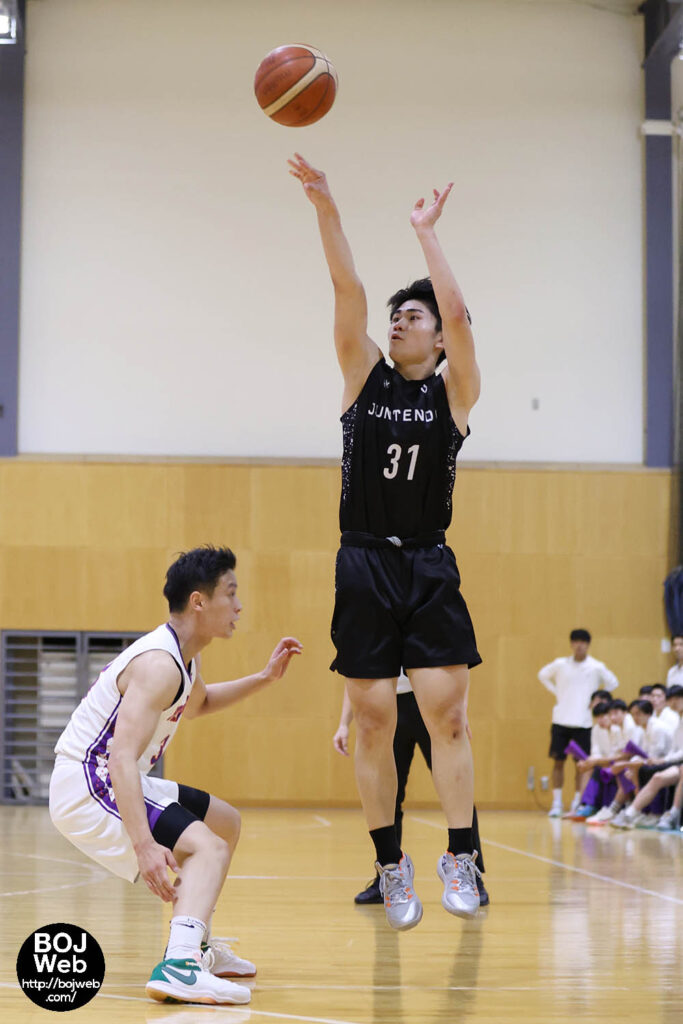 順天堂大と立教大の戦いは、前半は互いに点の取り合いになり互角の勝負になるが、3Qに順天堂大がディフェンスで立教大を抑え、またオフェンスではスリーポイントやペイントアタックで10点差をつける。立教大は4Q、#21田中(3年・SF)のシュートで追い上げるが、順天堂大もタフショットを粘り強く決めて追いつかせない。残り5分かから点差が4点程度で攻防が続くが、残り2分で#21田中のスリーポイントが決まり立教大が1点差に迫った。しかし順天堂大も返し、残り1分をきって再び点差は4。ファウルゲームに突入するが順天堂大が逃げ切り90-82。立教大は初勝利ならず。