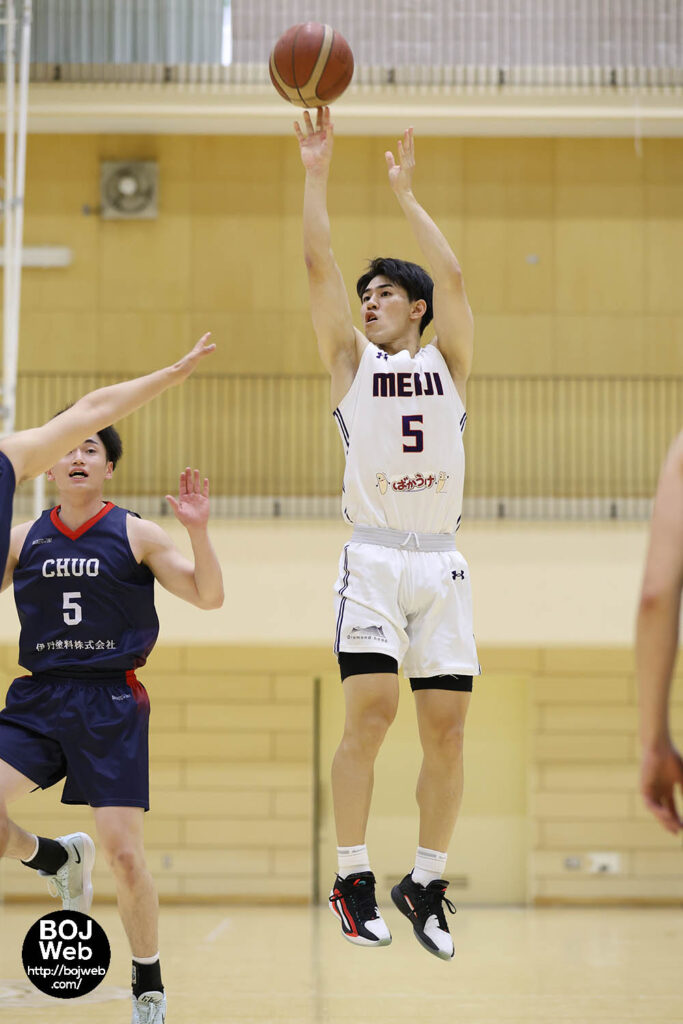 前節のホームゲームで日本体育大に勝利した中央大は、明治大相手には苦戦した。明治大はシュート力の高い中央大に簡単には打たせず、#10鬼澤(3年・PF)や#60武藤(3年・SF)がリバウンドを押さえ、攻撃では高さのない中央大インサイドを攻める。要所で#23森田(3年・PG)や#5針間(4年・SG)、#90塚田(3年・PF)のスリーポイントも決まった。中央大は劣勢ながら3Qの頭には同点にし、差がほぼない状態でついていくが、シュートの精度が上がって来ず、4Qの頭に一気に10点近く引き離されてしまう。明治大はそのままリードを保ち50-67。中央大は武器のスリーポイントも4本しか決められず、良さが出せずに終わった。