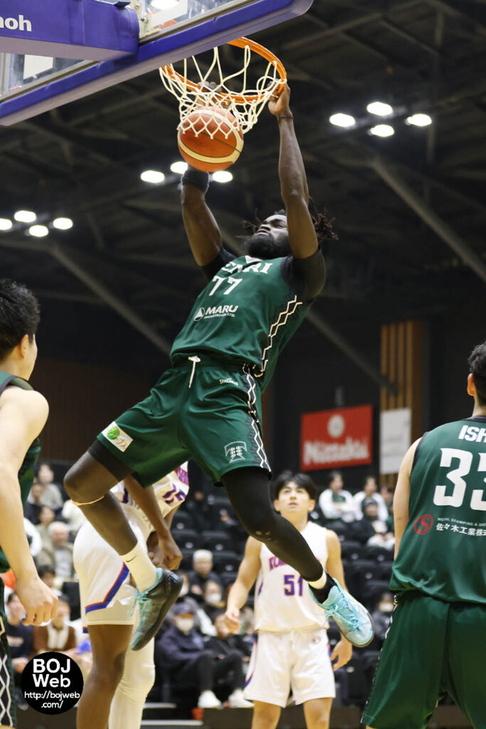 序盤から激しいディフェンスでプレッシャーを与える天理大は国士舘大にゲームの組み立てを許さず、高い位置からのプレスでミスを誘う。国士舘大はターンオーバーやボールが回らずタフショットが続いた。インサイドでは天理大の#77オルワペルミ(1年・C・日本航空)が存在感を発揮。国士舘大は打たされる形でシュート精度が上がらず、ディフェンスも後手になると、再三ハイローでも得点を許し、最大15点前後のビハインドを終始背負うことになった。天理大もスコア面ではハイペースにはならず、一気に突き放す形にはならない。終盤になるとようやく国士舘大のアウトサイドが決まる場面もあった。しかし大きくは点差を詰められず58-70。見事天理大が昨年の雪辱を果たし、関東のチーム相手に1回戦を突破した。