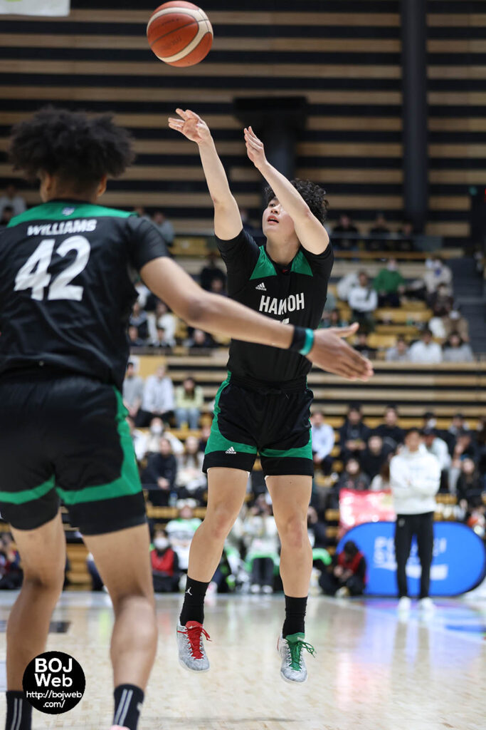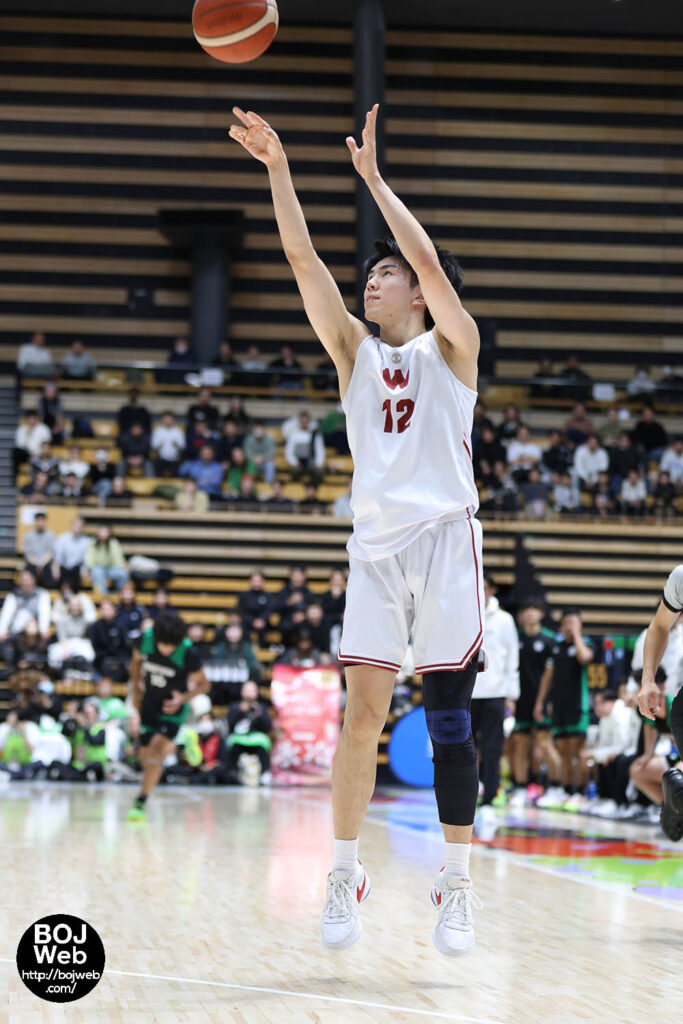 1Qは互いに得点し合う立ち上がりになるが、次第に早稲田大が得点力を発揮し、#6三浦(3年・F)や#12松本(1年・SF・洛南)のスリーポイントが続けて決まると一気に10点以上の差がついた。しかしファウルも混んで#0下山(3年・PG)が2つ目を吹かれてしまう。29-21で入った2Qは1Qと反対に白鷗大が爆発。高さを生かしたゴール下や速攻などで追い上げ、#25モンガ(4年・PF)のバスケットカウントで残り4分には逆転に成功。その後も得点を重ねてこのQは32点。早稲田大はファウルが続き、またシュートが当たらず14点に終わった。