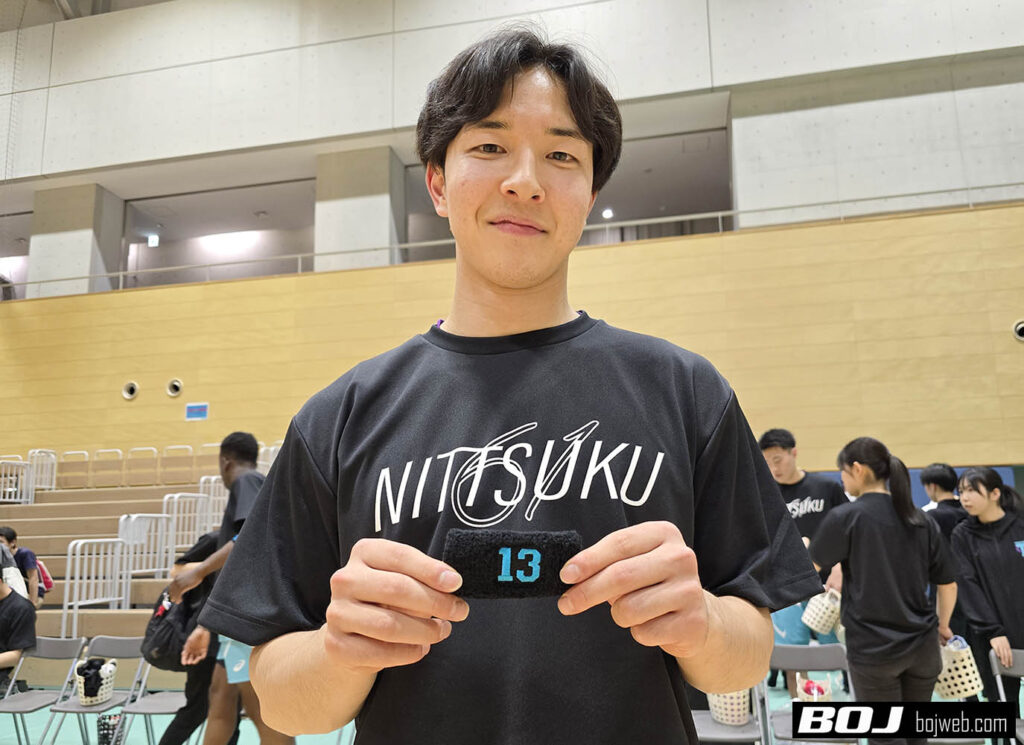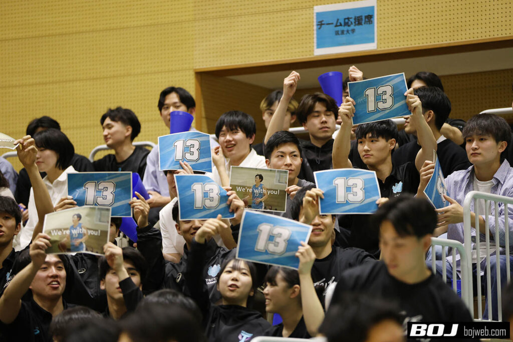 互いのチーム応援が賑やかなのが定期戦らしさだが、この日の筑波大の応援席ではタイムアウトをはじめ、さまざまなタイミングでボードが掲げられた。そこにあったのは「13」の文字と選手の写真。そして選手個々も「13」が刺繍されたリストバンドを身につけていた。